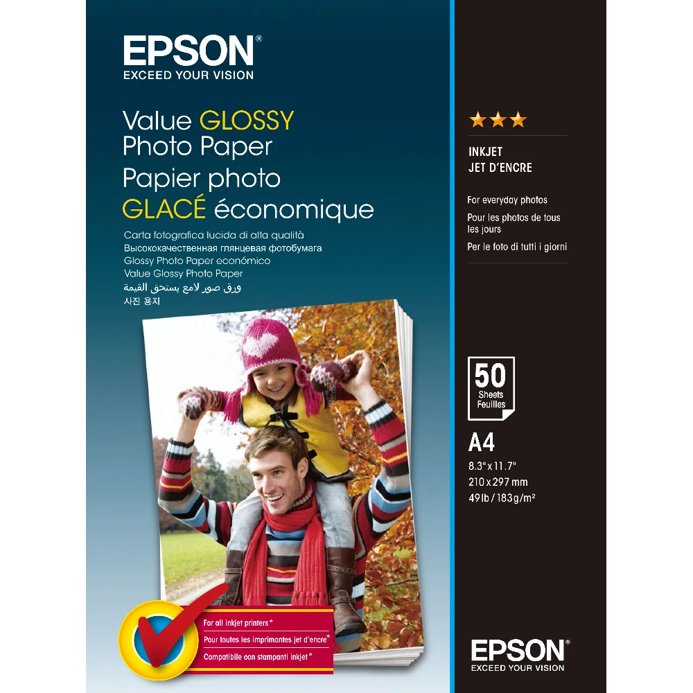 Value Glossy Photo Paper - A4 - 20 sheets Epson Value Glossy Photo Paper - A4 - 20 sheets. Finish type: Gloss, Media weight: 183 g/m², Paper size: A4. Quantity per pack: 1 pc(s), Package width: 220 mm, Package depth: 300 mm. Pallet width (UK): 100 cm, Pallet length (UK): 120 cm, Pallet height (UK): 74.2 cm. Country of origin: Japan It's easy and affordable to print glossy photos at home with Epson's Value Glossy Photo Paper. Providing plenty of choice, this versatile paper is designed to work with any rear feed inkjet printer, and comes in different sizes and pack volumes. Everyday photo printing