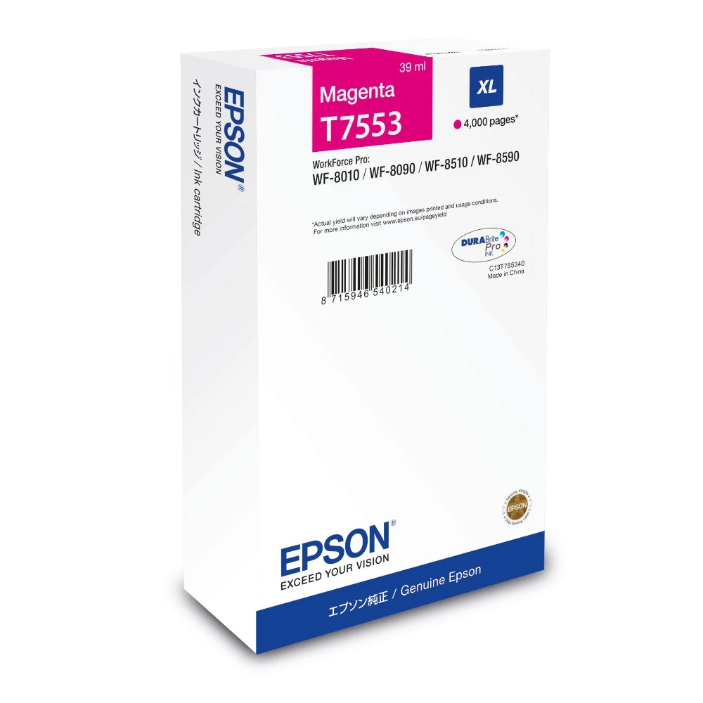 WF-8xxx Series Ink Cartridge XL Magenta Epson WF-8xxx Series Ink Cartridge XL Magenta. Cartridge capacity: High (XL) Yield, Supply type: Single pack, Colour ink page yield: 4000 pages, Colour ink volume: 39 ml, Quantity per pack: 1 pc(s)