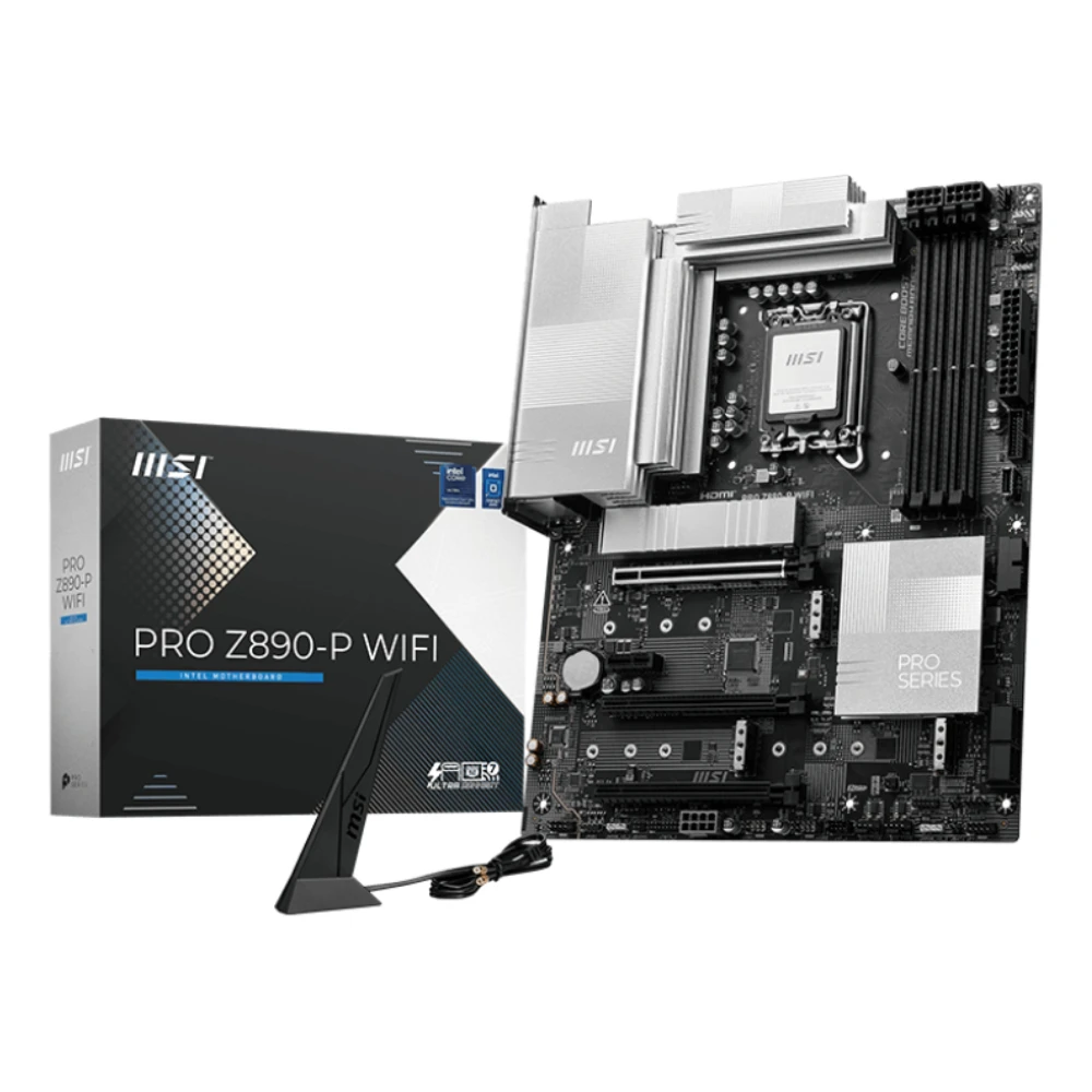 MSI PRO Z890-P WIFI. Processor manufacturer: Intel, Processor socket: LGA 1851 (Socket V1), Compatible processor series: Intel Core Ultra (Series 2). Supported memory types: DDR5-SDRAM, Maximum internal memory: 256 GB, Memory slots type: DIMM. Supported storage drive interfaces: M.2, SATA III, Supported storage drive types: HDD & SSD, RAID levels: 0, 1, 5, 10. Ethernet interface type: 5 Gigabit Ethernet, Top Wi-Fi standard: Wi-Fi 7 (802.11be), Wi-Fi standards: 802.11a, 802.11b, 802.11g, Wi-Fi 4 (802.11n), Wi-Fi 5 (802.11ac), Wi-Fi 6 (802.11ax), Wi-Fi 6E.... Component for: PC, Motherboard form factor: ATX, Motherboard chipset family: Intel