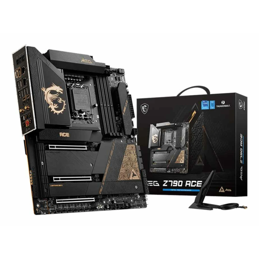 MSI MEG Z790 ACE. Processor manufacturer: Intel, Processor socket: LGA 1700, Compatible processor series: Intel® Celeron®, Intel® Pentium® Gold. Supported memory types: DDR5-SDRAM, Maximum internal memory: 128 GB, Memory channels: Dual-channel. Supported storage drive interfaces: M.2, PCI Express, Supported storage drive types: HDD & SSD, Internal storage capacity: 10 GB. Ethernet interface type: 2.5 Gigabit Ethernet, Top Wi-Fi standard: Wi-Fi 6 (802.11ax), Wi-Fi standards: 802.11a, 802.11b, 802.11g, Wi-Fi 4 (802.11n), Wi-Fi 5 (802.11ac), Wi-Fi 6 (802.11ax). Component for: PC, Motherboard form factor: Extended ATX, Motherboard chipset family: Intel