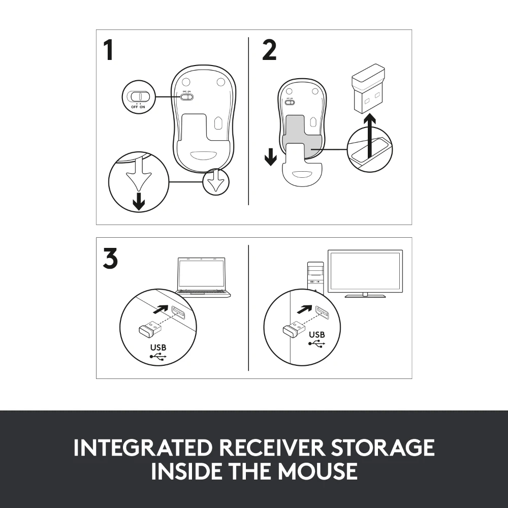 Logitech® Wireless Mouse M185. A simple, reliable mouse with plug-and-play wireless. You get the reliability of a cord with wireless convenience and freedom—fast data transmission and virtually no delays or dropouts. The 1-year battery life means fewer hassles, too.* You’ll enjoy the high quality and reliability that have made Logitech the global leader for mice—plus a three-year limited hardware warranty. The tiny nano receiver works right away without software and is small enough to leave in your USB port so you won’t lose it. And on top of that, this comfy, contoured mouse treats your hand right.