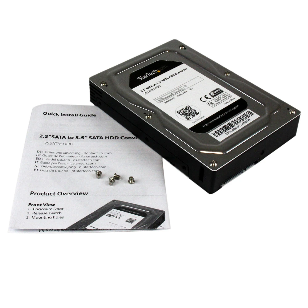StarTech.com 2.5” to 3.5” SATA Aluminum Hard Drive Adapter Enclosure SSD / HDD Height up to 12.5mm - 2.5in to 3.5in SATA SSD/HDD Converter StarTech.com 2.5” to 3.5” SATA Aluminum Hard Drive Adapter Enclosure with SSD / HDD Height up to 12.5mm. Size (imperial): 8.89 cm (3.5"), Type: Storage drive tray, Product colour: Black, Silver. Width: 102 mm, Depth: 146 mm, Height: 36 mm. Package width: 115 mm, Package depth: 163 mm, Package height: 38 mm. Cables included: SATA. Products per master (outer) case: 32 pc(s), Master (outer) case width: 313 mm, Master (outer) case length: 342 mm Turn a 2.5” SATA HDD/SSD into a 3.5” SATA Drive