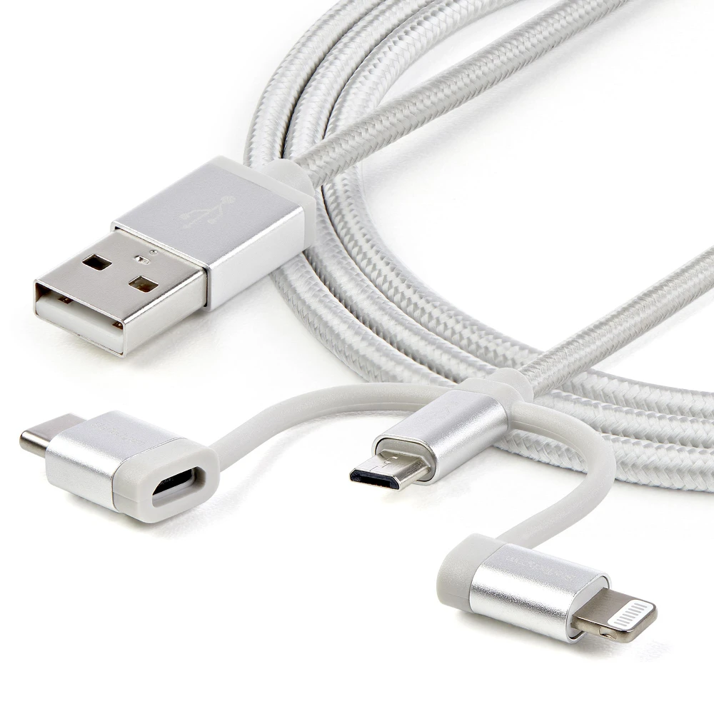 StarTech.com 1 m (3 f.t) USB Multi Charging Cable - USB to Micro-USB or USB-C or Lightning for iPhone / iPad / iPod / Android - Apple MFi Certified - 3 in 1 USB Charger - Braided. Cable length: 1 m, Connector 1: USB A, Connector 2: Micro-USB B, USB version: USB 2.0, Maximum data transfer rate: 480 Mbit/s, Connector contacts plating: Nickel, Product colour: Silver