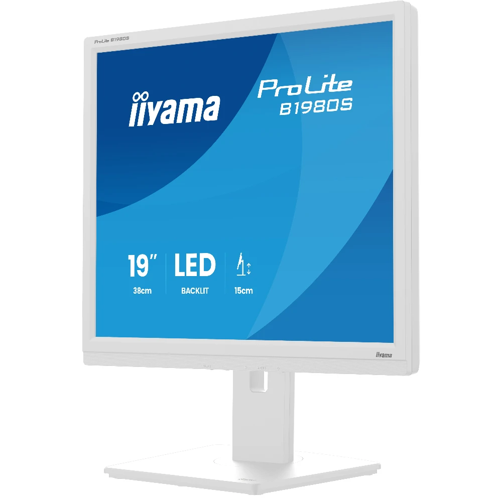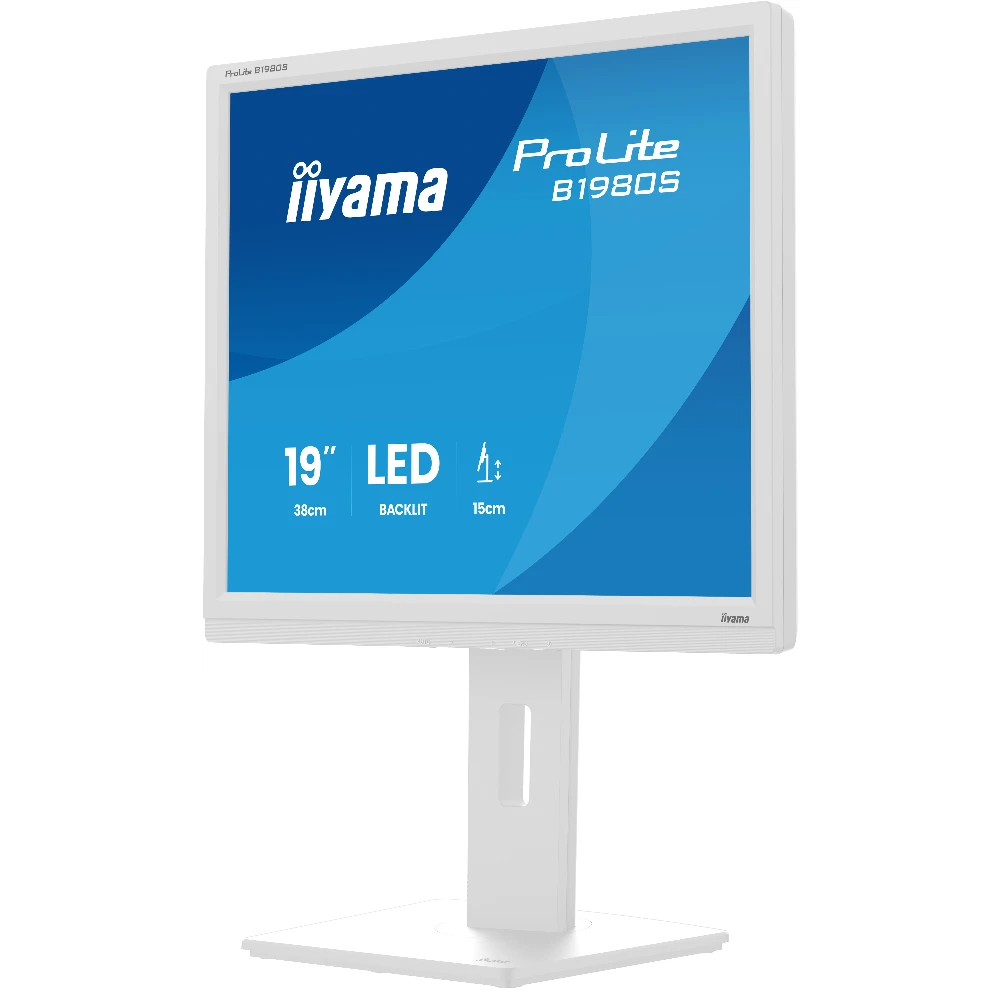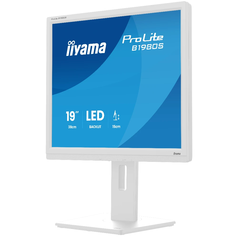 iiyama ProLite B1980S-W1. Display diagonal: 48.3 cm (19"), Display resolution: 1280 x 1024 pixels, HD type: SVGA, Display technology: LED, Response time: 3 ms, Native aspect ratio: 5:4, Viewing angle, horizontal: 170°, Viewing angle, vertical: 160°. Built-in speaker(s). VESA mounting, Height adjustment. Product colour: White