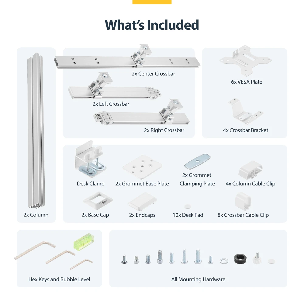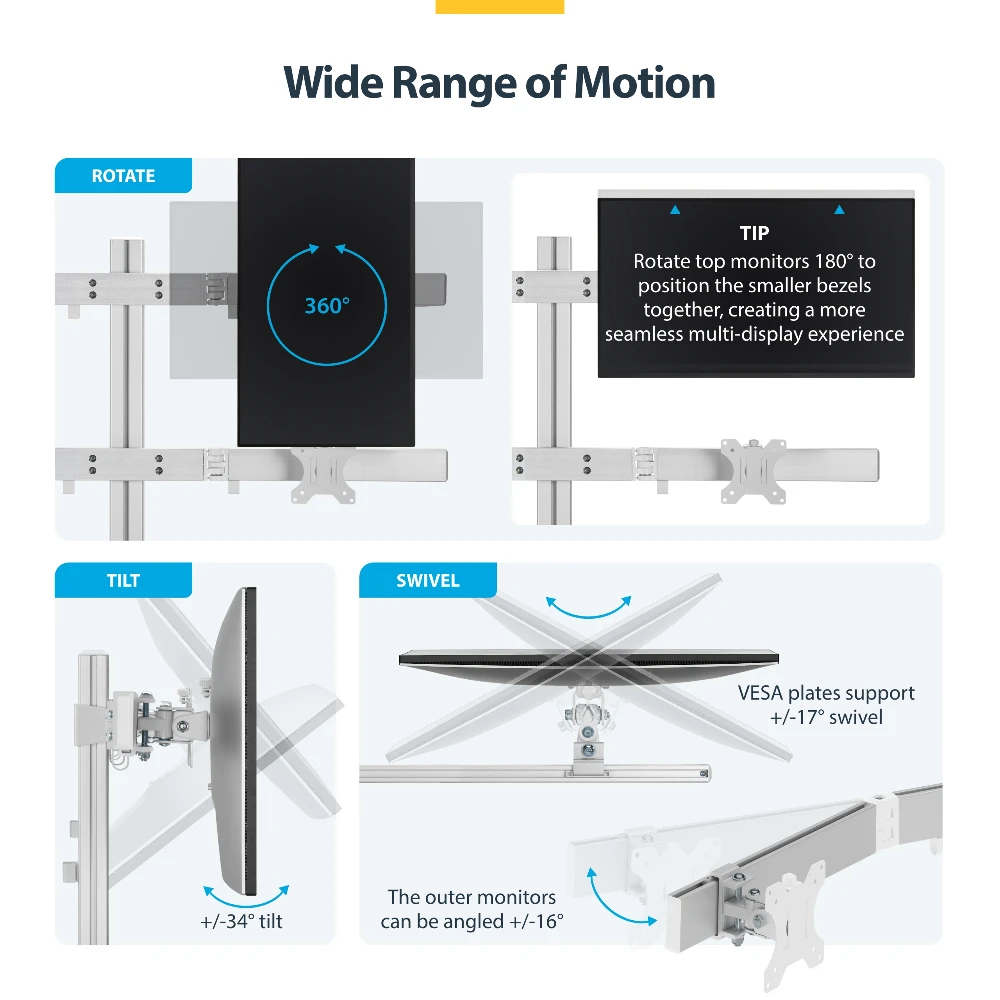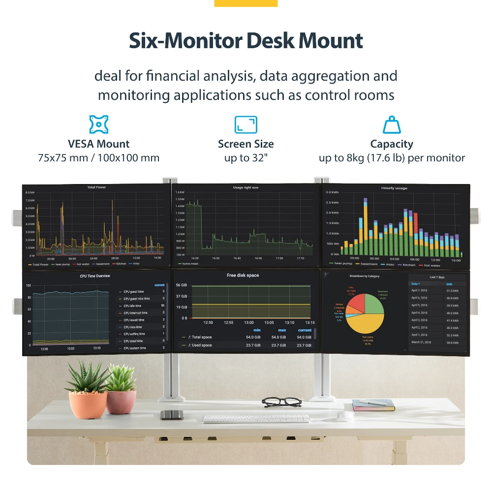 StarTech.com Six-Monitor Desk Mount w/ Crossbar, Up To 32-inch Computer Screens/Max 17.6lb each, Dual Column, C-clamp/Grommet StarTech.com Six-Monitor Desk Mount with Crossbar, Up To 32-inch Computer Screens, Max 17.6lb (8kg) each, Dual Column, C-clamp/Grommet, Height Adjustable. Mounting: Clamp/Grommet, Maximum weight capacity: 48 kg, Minimum screen size: 43.2 cm (17"), Maximum screen size: 81.3 cm (32"), Minimum VESA mount: 75 x 75 mm, Maximum VESA mount: 100 x 100 mm. Height adjustment, Swivel angle range: -17 - 17°, Tilt angle range: -34 - 34°. Product colour: White - Six-monitor mount with crossbar design; Adjustable VESA 75/100 for up to 32-inch and 17.6lb per screen - Robust dual column monitor mount with improved base design that won't tilt over time - Micro-height adjustment for perfect display alignment; Ergonomic monitor mounts support +/-17° swivel +/-34° tilt and 360° rotation for portrait/landscape - Rigid mounting options with C-clamps for desks 0.4-2.9" thick or grommet mounts for desks 0.4-1.7" thick - Includes cable clips for a tidy setup Six monitor desk mount with support up to 32" displays with articulation and height adjustment. VESA compatible 75x75/100x100