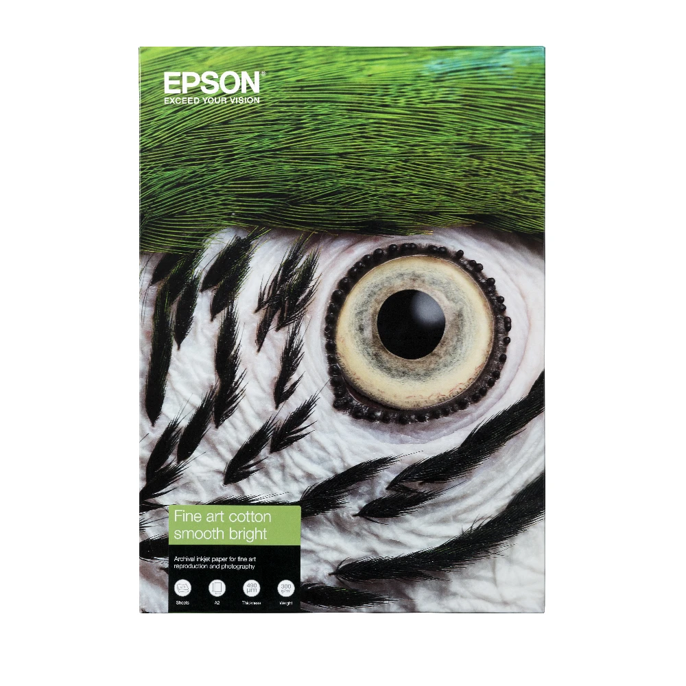 Fine Art Cotton Smooth Bright A3 25 Sheets Epson Fine Art Cotton Smooth Bright A3+ 25 Sheets. Type: Art paper, Sheets quantity: 25 sheets, Media weight: 300 g/m?. Sheet width: 32.9 cm, Sheet length: 48.3 cm, Roll width: 32.9 cm. Package width: 340 mm, Package depth: 490 mm, Package height: 20 mm. Doesn't contain: Acid. Products per master (outer) case: 10 pc(s), Country of origin: United Kingdom Enjoy the smooth and bright finish of this fine art paper. Using exceptional raw materials, this acid-free, hot press, cotton-based archival paper will faithfully reproduce colours, tones and details - and secure them for years to come. They?re designed to work seamlessly with Epson?s range of pigment-based ink printers. Archival quality