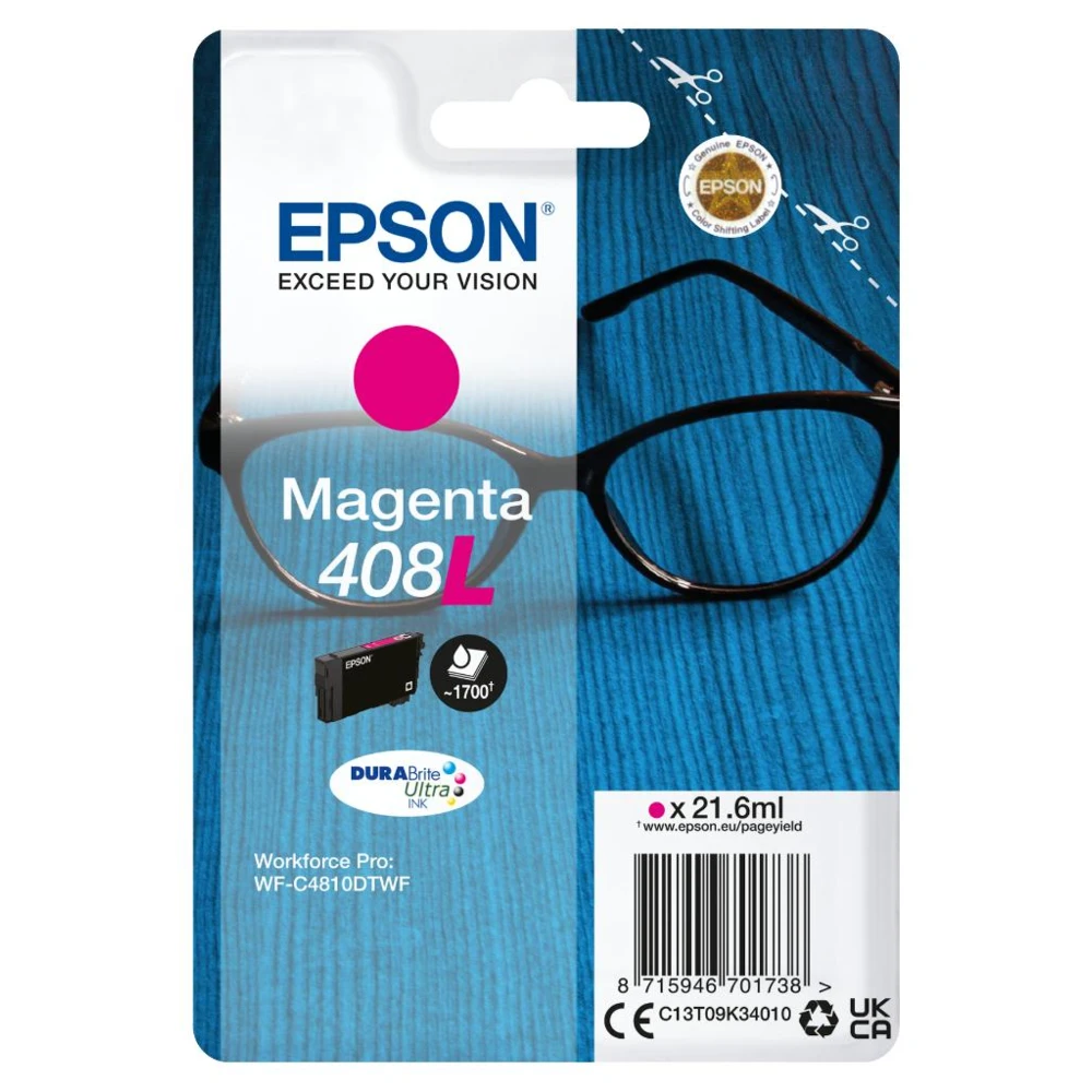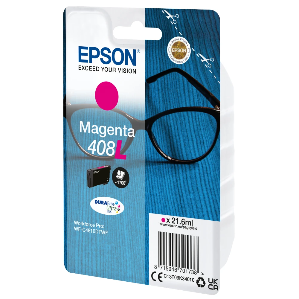 Singlepack Magenta 408L DURABrite Ultra Ink Epson C13T09K34010. Colour ink type: Pigment-based ink, Cartridge capacity: High (XL) Yield, Supply type: Single pack, Colour ink page yield: 1700 pages, Colour ink volume: 21.6 ml, Quantity per pack: 1 pc(s) Epson's DURABrite Ultra Ink is ideal for producing laser-like, business documents. Thanks to its all-pigment ink system, documents are water, smudge and highlighter resistant and its quick-drying properties make it perfect for duplex printing and there?s an affordable cartridge to suit every type of user with both standard and XL sizes available. Find it easily in store by looking for the Spectacles image.
